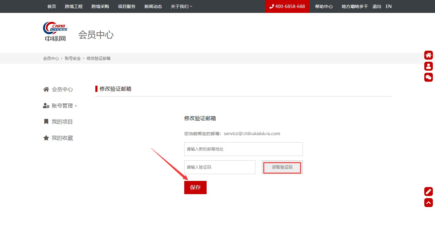 2.输入新的邮箱地址及邮箱验证码,点击“保存”即可修改成功