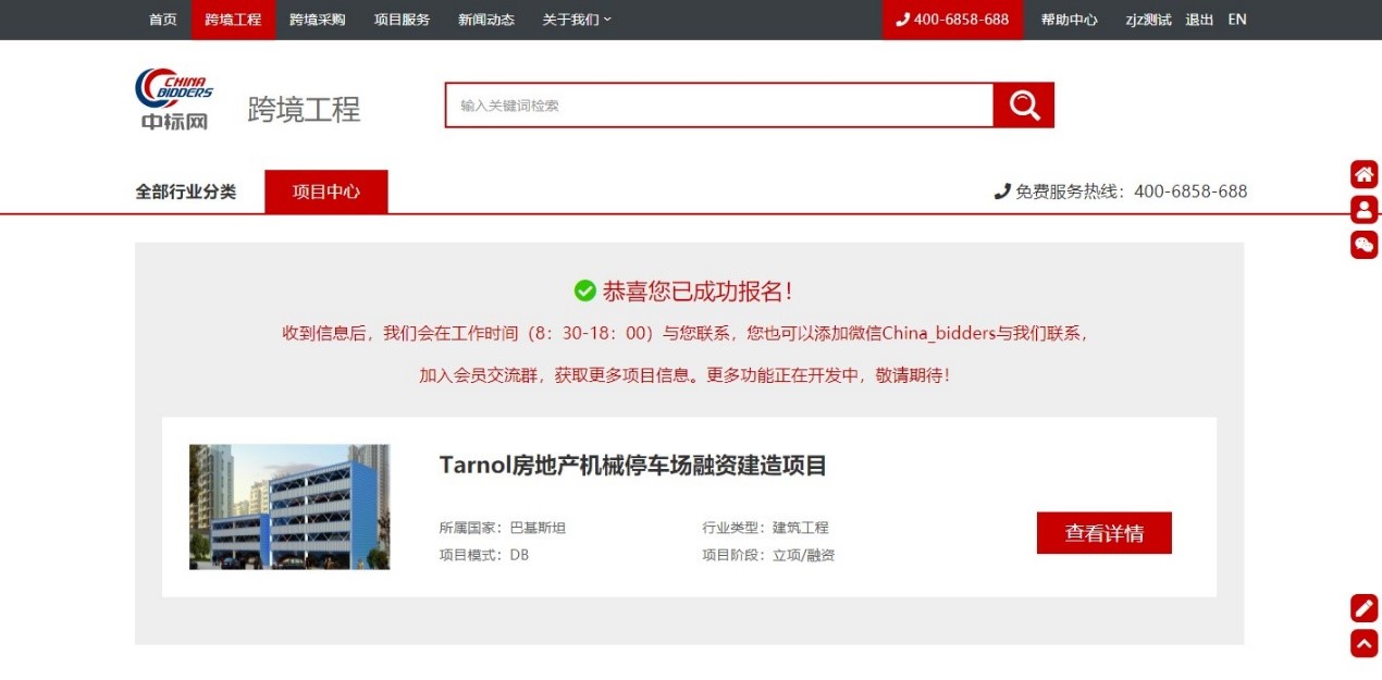 2.方式二,进入中标网首页,在跨境工程模块,点击【立即参与】