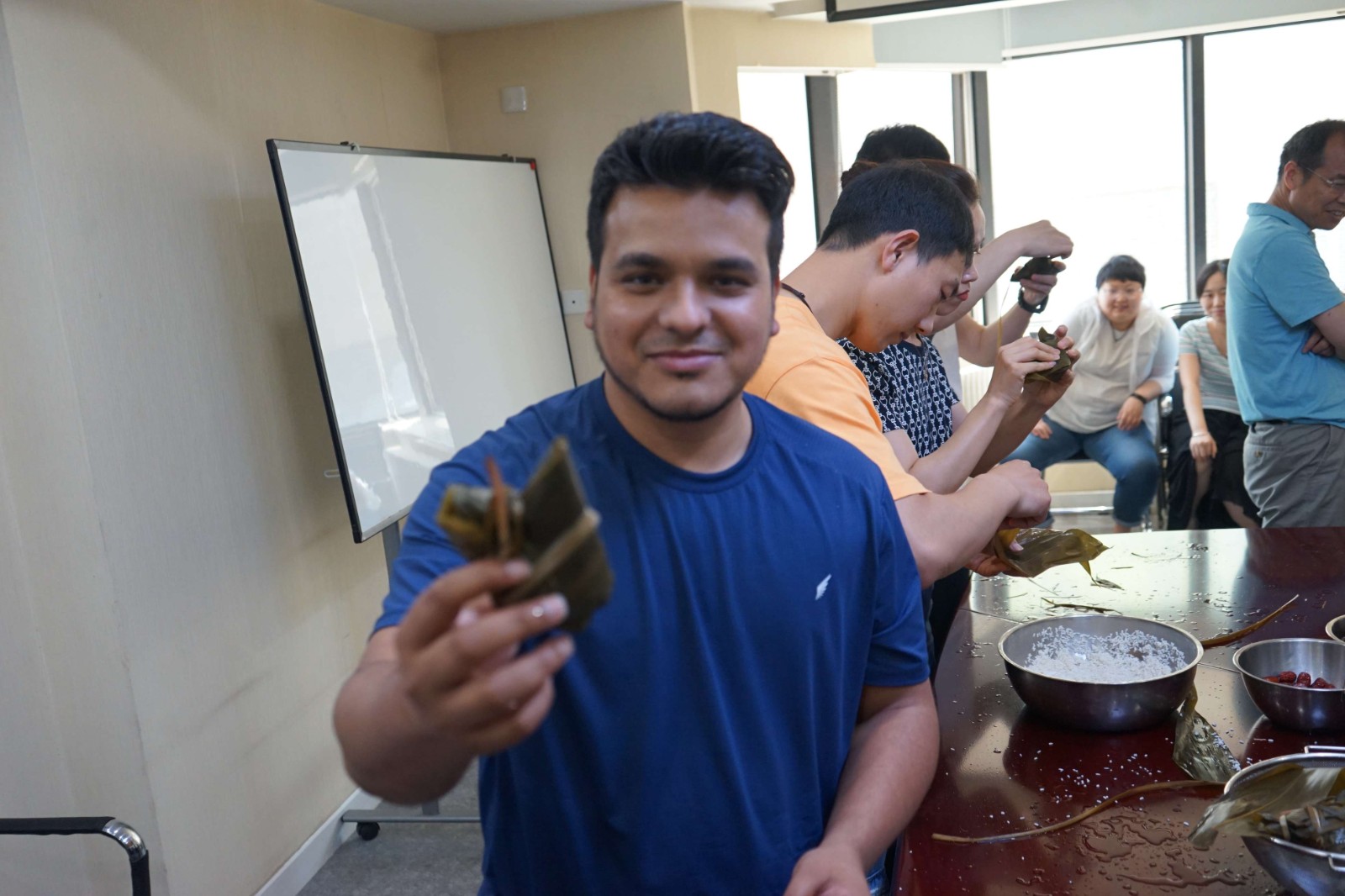 活动现场公司为我们准备了糯米、粽叶、红枣、蜜枣和花生等物料......经验丰富的员工不慌不忙,卷粽叶、填糯米、捏角捆绑……一整套动作行云如水般利落完成。另一边,现学现卖经验不足的则手忙脚乱,屡屡出现漏米、粽叶被弄破的现象,包出来的成品也是歪歪扭扭,各具特色,惹得大家哄堂大笑,也给活动现场增添了不少的乐趣。