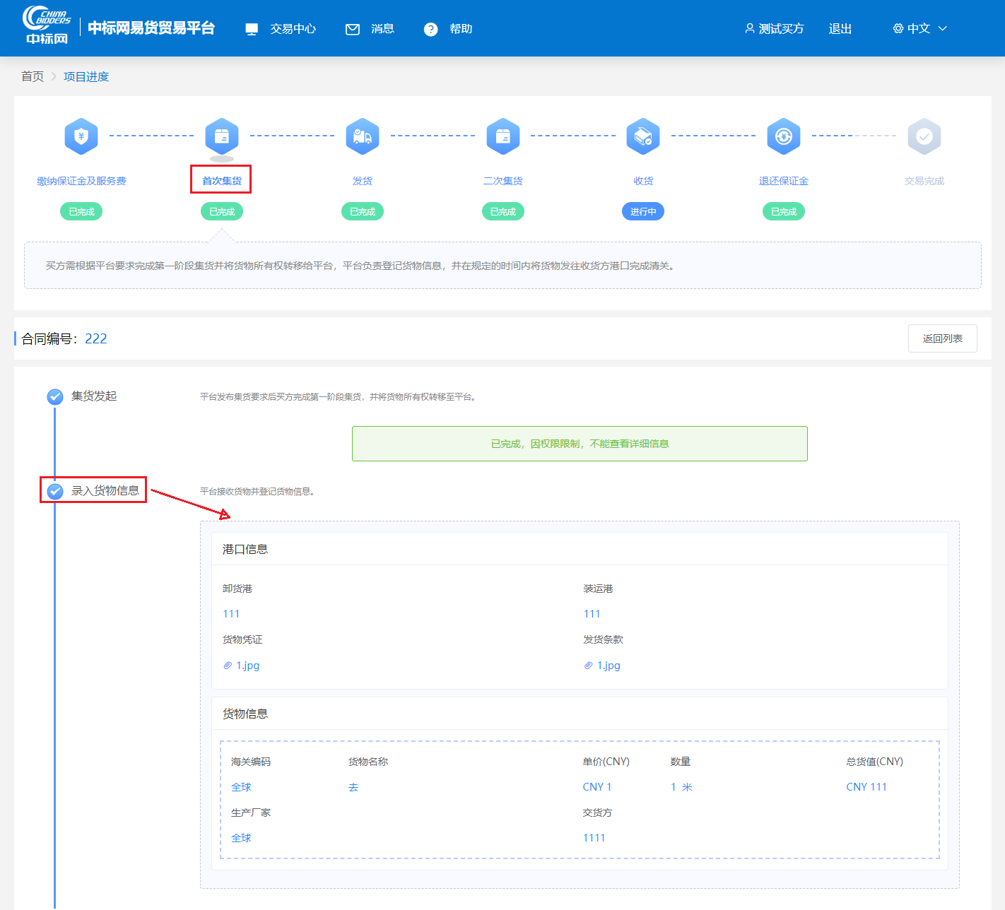(1)买方可在“项目跟踪—二次集货—录入货物信息”处查看货物详情。